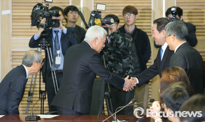 (서울=포커스뉴스) 27일 오전 서울 여의도 국회 의원회관에서 열린 국민의당-통합신당 통합발표 기자회견에 참석한 김한길(왼쪽 두번째) 국민의당 상임부위원장과 박주선(오른쪽 두번째) 통합신당 창당준비위원장이 인사하고 있다.
