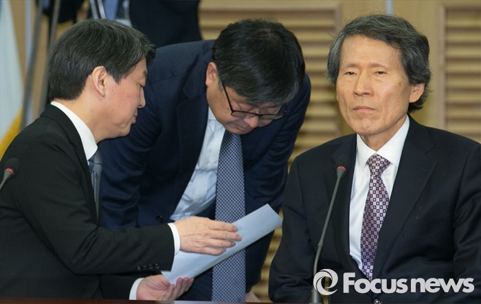 (서울=포커스뉴스) 27일 오전 서울 여의도 국회 의원회관에서 열린 국민의당-통합신당 통합발표 기자회견에 안철수(왼쪽) 국민의당 인재영입위원장과 최원식(가운데) 대변인이 대화하고 있다. 오른쪽은 한상진 공동창당준비위원장.
