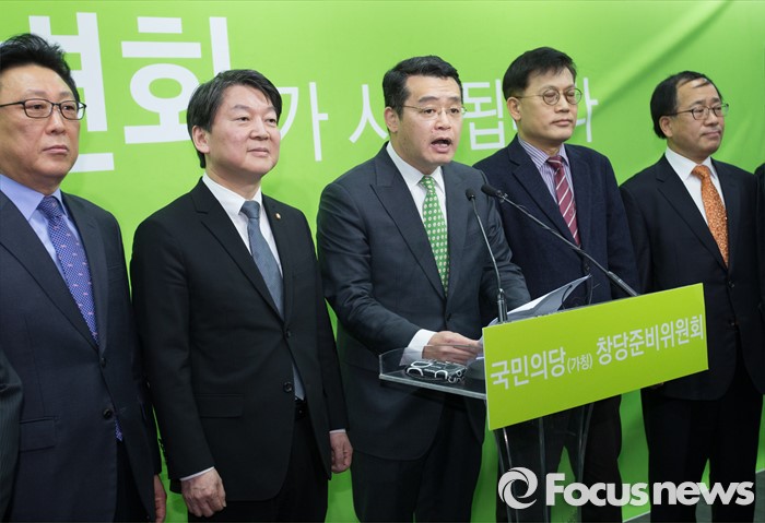 (서울=포커스뉴스) 더불어민주당 출신 정무직 당직자들이 27일 오전 서울 마포구 국민의당 당사 브리핑룸에서 안철수 인재영입위원장과 함께 입당기자회견을 하고 있다.