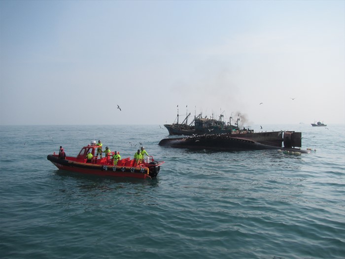 (서울=포커스뉴스) 27일 오전 전남 신안군 흑산면 가거도 북서쪽 해상에서 중국어선이 전복, 서해어업관리단과 목포해양경비안전서 구조대원들이 구조작업을 하고 있다. <사진제공=해양수산부 서해어업관리단>