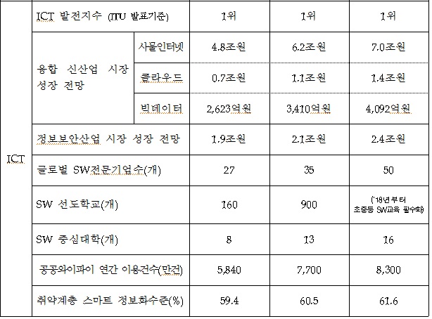 정보보호 분야에서는 기술개발 투자를 지난해 290억원에서 올해는 440억원으로 확대하고 중동, 아프리카 등 해외 4개 권역에 거점을 구축, 해외진출을 지원한다. 이밖에 위협정보 분석·공유시스템(C-TAS) 참여기관 및 민간 주요기반시설 신규지정을 확대한다. 아울러 사이버안전 대진단 강화, ICT 융합 시큐리티 기반 구축 등에도 적극 나설 계획이다.미래부의 ICT 분야 2016년 업무계획에 따른 기대효과.<표제공=미래부>