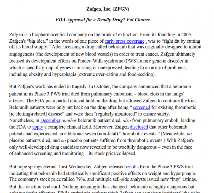 케리스데일캐피탈(Kerrisdale Capital) 헤지펀드는 최근 보고서에서 "벨로라닙이 FDA 승인을 받을 가능성은 희박하다(Fat Chance)" 며 미국에서 임상3상을 진행했던 제약사 자프겐(Zafgen)의 가치를 주당 3달러로 제시했다. 자프겐의 최근 주가는 7-8달러로 사실상 매도 의견이다.