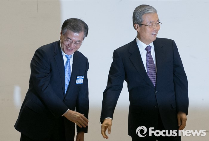 (서울=포커스뉴스) 27일 오후 서울 여의도 국회에서 열린 더불어민주당 중앙위원회의에 참석한 문재인(왼쪽) 대표와 김종인 선대위원장 겸 비대위원장이 인사 후 자리로 향하고 있다.