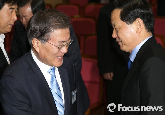 (서울=포커스뉴스) 27일 오후 서울 여의도 국회에서 열린 더불어민주당 중앙위원회의에 참석한 문재인(왼쪽) 대표와 김상곤 인재영입위원장이 인사한 뒤 자리로 향하고 있다.