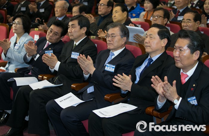 (서울=포커스뉴스) 27일 오후 서울 여의도 국회에서 열린 더불어민주당 중앙위원회의에 참석한 문재인 대표 등 지도부가 박수치고 있다. 오른쪽부터 정청래 최고위원, 김상곤 인재영입위원장, 문 대표, 이종걸 원내대표, 전병헌, 유승희 최고위원.
