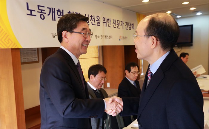 (서울=포커스뉴스) 이기권 고용노동부 장관은 28일 오전 서울 중구 프레스센터에서 열린 노동개혁 현장 실천을 위한 전문가 간담회에 참석자들과 악수를 하고 있다. <사진제공=고용노동부>