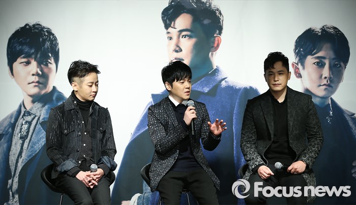(서울=포커스뉴스) 27일 오후 서울 용산구 현대카드 언더스테이지에서 열린 엠씨 더 맥스(M.C The Max) 정규 8집 'pathos' 발표 기자간담회에 참석한 멤버 전민혁이 진행자의 질문에 답하고 있다. 왼쪽부터 제이윤, 전민혁, 이수.