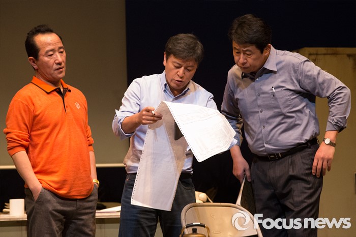 (서울=포커스뉴스) 27일 오전 서울 중구 명동예술극장에서 열린 연극 '날 보러와요' 프레스콜에 배우 유연수(박형사), 권해효(김형사), 이대연(김반장)이 연기하고 있다.