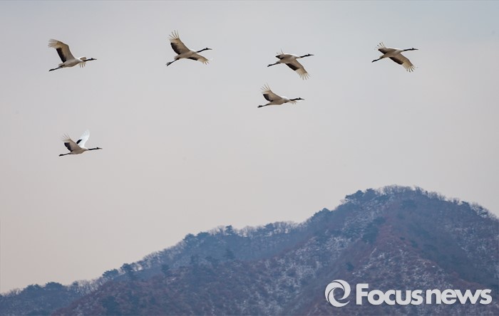 (철원=포커스뉴스) 겨울 진객 두루미가 26일 강원 철원군 인근에서 무리 지어 날고 있다.