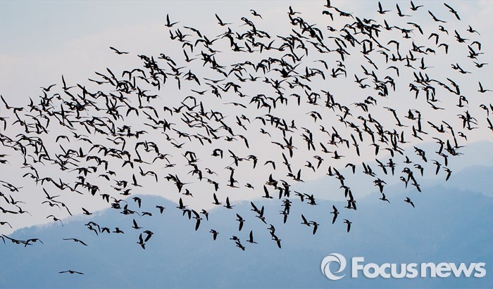 (철원=포커스뉴스) 26일 강원 철원군 한탄강 위로 쇠기러기들이 떼지어 날고 있다.