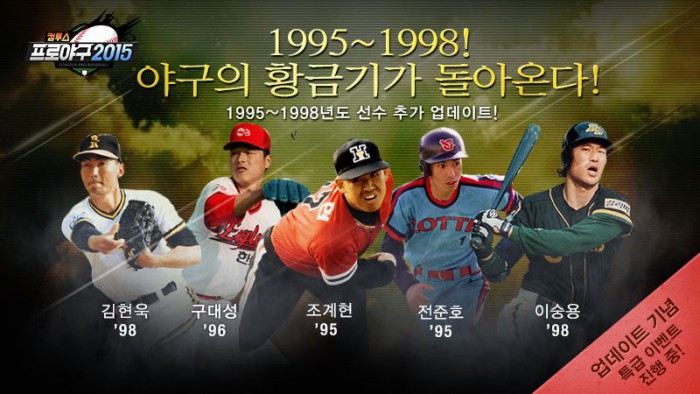 이번에 추가된 선수들은 지난 1995~1998년까지 한국 프로야구의 황금기를 이끈 타자 460명, 투수 405명 등 총 865명이다. 특히, 구대성, 조계현, 전준호, 이숭용, 김현욱 등 당시 투타 최고의 에이스 선수들도 포함돼 '컴프야2015' 이용자들의 큰 기대를 모으고 있다.