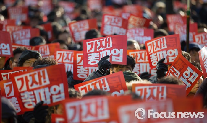 (서울=포커스뉴스) 27일 오후 서울 종로구 세종로 소공원에서 열린 '민주노총 총파업 수도권대회'에 참가한 민주노총 조합원들이 정부의 노동법 개정 중단을 촉구하는 구호를 외치고 있다.