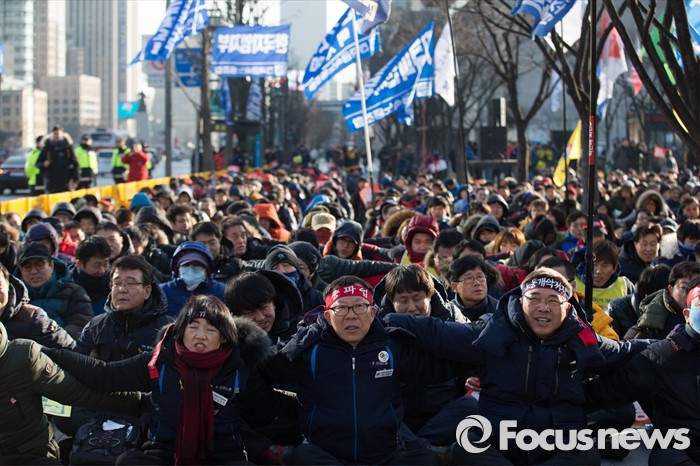 (서울=포커스뉴스) 27일 오후 서울 종로구 세종로 소공원에서 열린 '민주노총 총파업 수도권대회'에 참가한 민주노총 조합원들이 정부의 노동법 개정 중단을 촉구하고 있다.