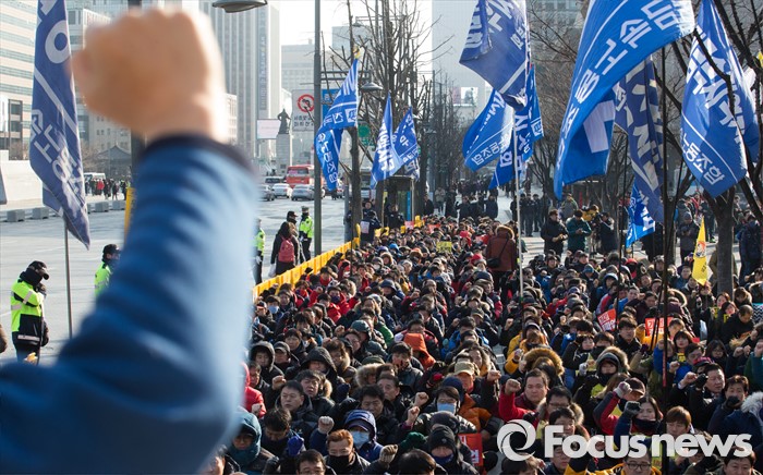 (서울=포커스뉴스) 27일 오후 서울 종로구 세종로 소공원에서 열린 '민주노총 총파업 수도권대회'에 참가한 민주노총 조합원들이 정부의 노동법 개정 중단을 촉구하는 구호를 외치고 있다.