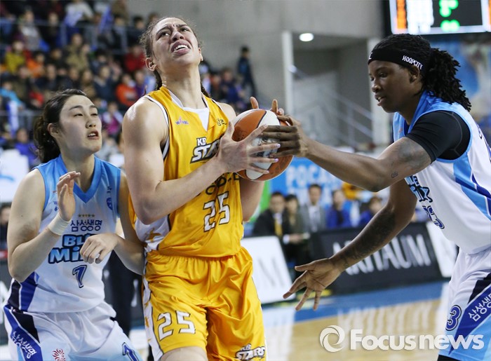 (용인=포커스뉴스) 27일 용인실내체육관에서 열린 2015-2016 여자프로농구 삼성생명-KB스타즈 경기에서 KB스타즈 햄비의 돌파를 삼성생명 해리스(오른쪽)가 저지하고 있다.