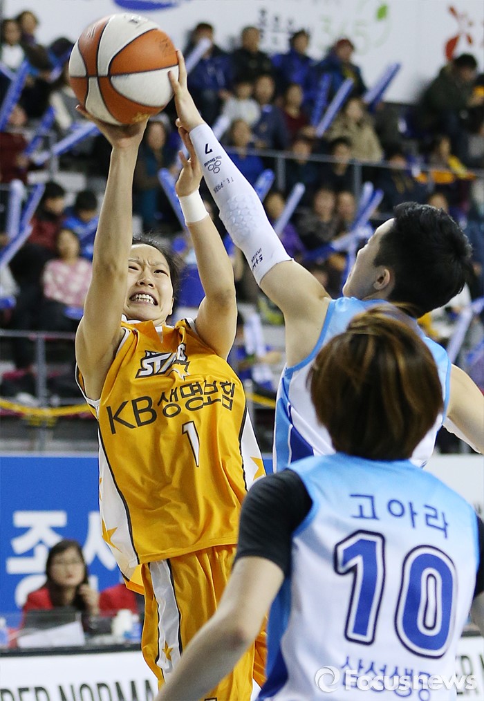 (용인=포커스뉴스) 27일 용인실내체육관에서 열린 2015-2016 여자프로농구 삼성생명-KB스타즈 경기에서 KB스타즈 홍아란의 점프슛을 삼성생명 박태은이 슛블록으로 저지하고 있다.