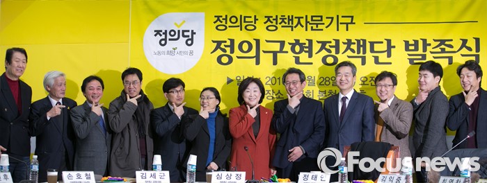 (서울=포커스뉴스) 28일 오전 서울 여의도 국회에서 정의당 정책자문기구 정의구현정책단 발족식에 참석한 심상정 상임대표 등 참석자들이 취재진을 향해 포즈를 취하고 있다.