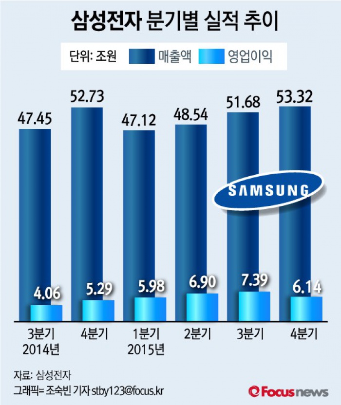 매출은 53조3200억원을 기록했다. 전년 동기인 2014년 4분기(52조7301억원)보다 1.11% 증가한 실적이며 지난해 3분기(51조6826억원)에 비해서는 3.16% 증가했다.