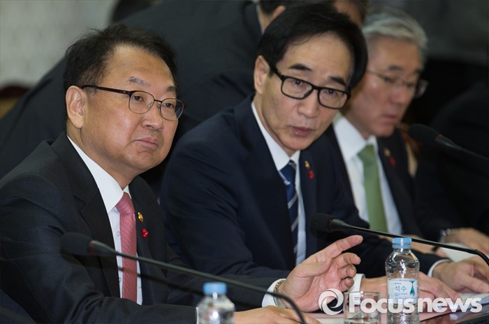 (서울=포커스뉴스) 28일 오전 서울 종로구 정부서울청사에서 열린 국가정책조정회의에 참석한 유일호(왼쪽) 경제부총리 겸 기획재정부 장관과 이준식(가운데) 사회부총리 겸 교육부장관이 논의하고 있다.
