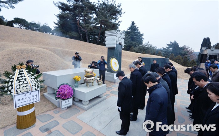 (서울=포커스뉴스) 28일 오전 서울 동작구 국립현충원을 찾은 김종인 더블어민주당 비상대책위원장이 비대위원들과 김대중 전 대통령 묘역을 참배하고 있다.