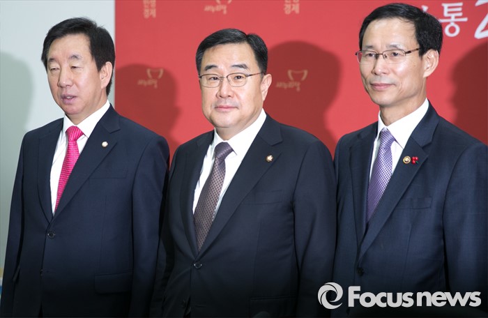 (서울=포커스뉴스) 28일 오전 서울 여의도 국회에서 열린 중고자동차 시장 선진화 관련 당정협의에 참석한 최정호(오른쪽부터) 국토교통부 2차관, 김정훈 새누리당 정책위의장, 김성태 예결정조위원장이 취재진을 향해 포즈를 취하고 있다.