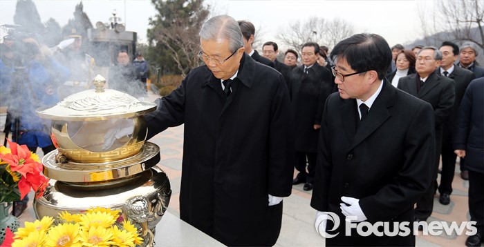 (서울=포커스뉴스) 28일 오전 서울 동작구 국립서울현충원에서 김종인 선거대책위원장 겸 비대위원장이 김대중 전 대통령 묘역 참배를 하고 있다.