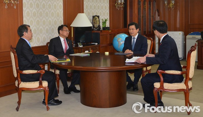(서울=포커스뉴스) 28일 오전 서울 종로구 정부서울청사에서 이석준(왼쪽부터) 국무조정실장, 유일호 경제부총리 겸 기획재정부 장관, 황교안 총리, 이준식 사회부총리 겸 교육부장관이 총리-부총리 협의회에 앞서 이야기를 나누고 있다.