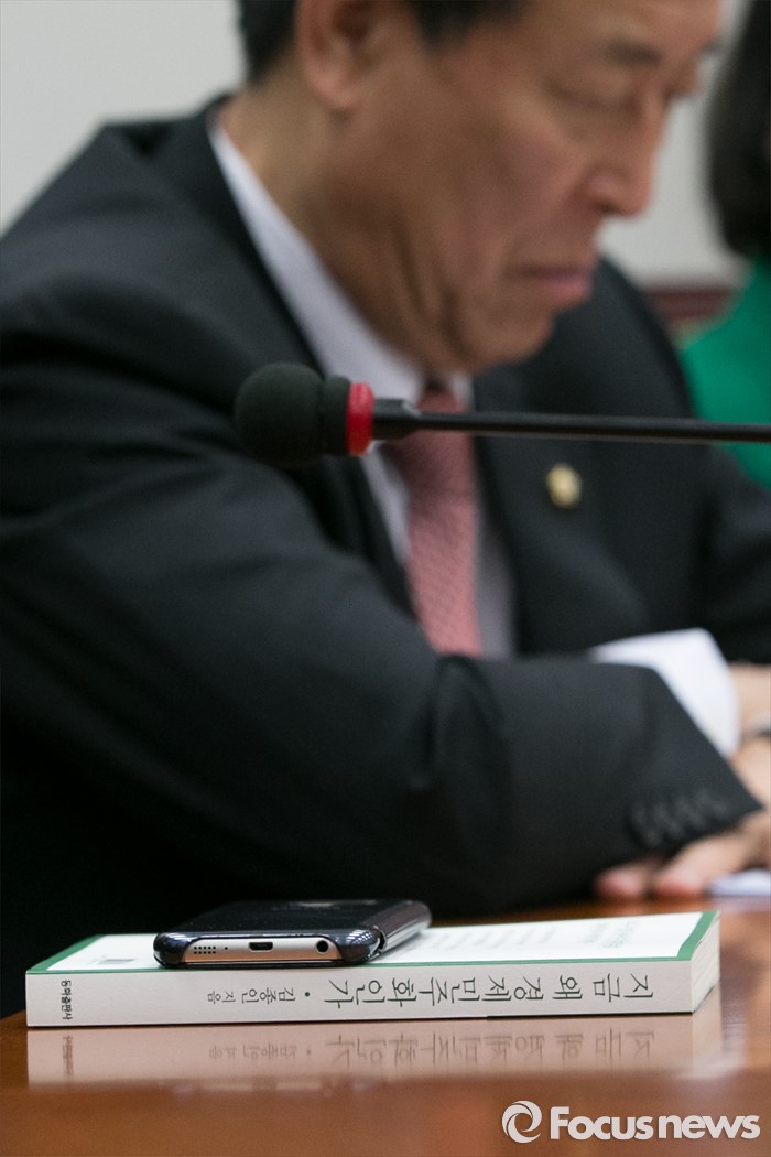 (서울=포커스뉴스) 28일 오전 서울 여의도 국회에서 열린 새누리당 최고위원회의에 김종인 더불어민주당 비대위원장의 저서 '지금 왜 경제민주화인가'가 놓여 있다.