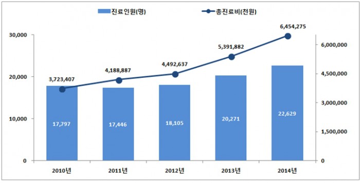 총 진료비는 2010년 약 37억원에서 2014년 약 65억원으로 5년 전에 비해 약 27억원이 늘어났다.