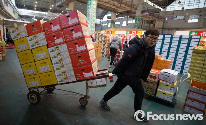 (대전=포커스뉴스) 설 멸정을 앞두고 28일 오전 대전 유성구 농수산물도매시장에서 상인들이 대목준비에 바쁘게 움직이고 있다.