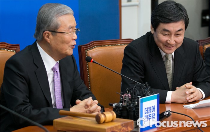 (서울=포커스뉴스) 28일 오전 서울 여의도 국회에서 열린 더불어민주당 첫 비대위원회의에 참석한 김종인(왼쪽) 위원장과 이종걸 원내대표가 대화하고 있다.