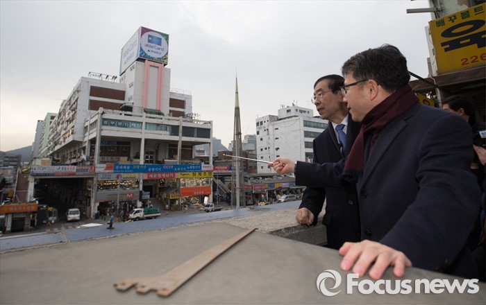 (서울=포커스뉴스) 박원순 서울시장이 28일 오전 서울 종로구 세운상가에서 세운상가 재생사업 현장 설명회를 마친 후 세운상가 주변 경관을 둘러보고 있다.