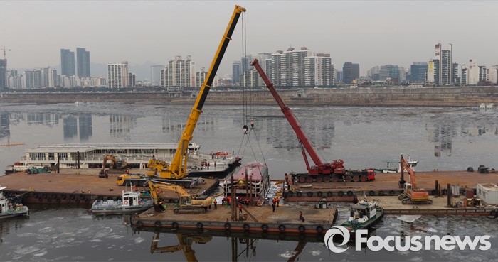 (서울=포커스뉴스) 28일 오후 서울 한강 영동대교 인근에서 침수된 이랜드 크루즈 유람선 인양 작업이 진행되고 있다.