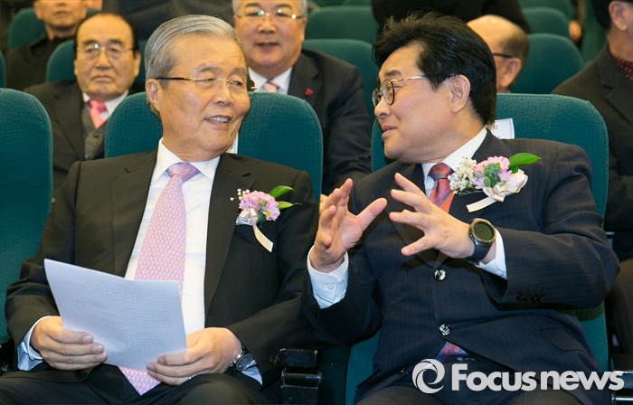 (서울=포커스뉴스) 28일 오후 서울 여의도 국회도서관에서 열린 더불어민주당 60년사 출판기념회에 참석한 김종인(왼쪽) 비대위원장과 전병헌 창당60주년 기념사업추진위원장이 대화하고 있다.