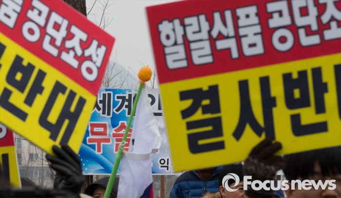 (세종=포커스뉴스) 28일 오후 세종시 정부세종청사 1동 앞에서 한국기독교총연합회, 한국교회연합회, 한국장로교총연합회, 한국교회언론회 등 종교인들이 집회를 갖고 할랄식품 테마단지 추진을 중단할 것을 촉구하고 있다.