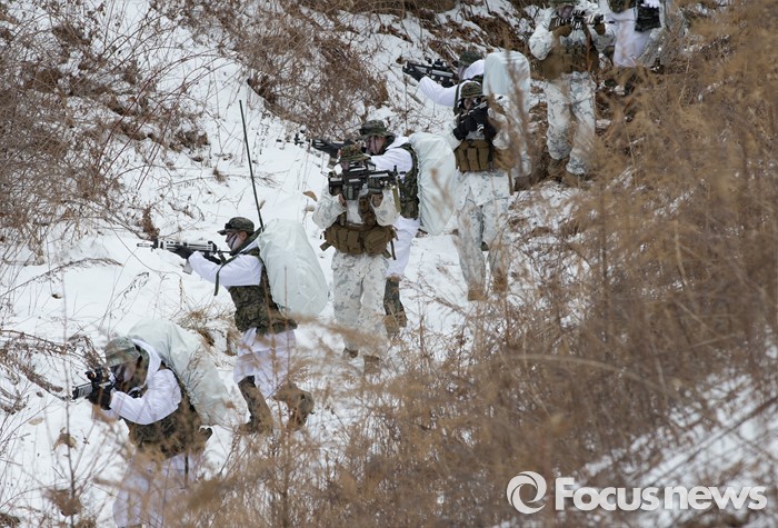 (평창=포커스뉴스) 28일 강원도 평창군 황병산 해병대 산악 종합훈련장에서 열린 '한·미 해병대 연합 동계 설한지 훈련'에 해병대 수색대대와 미 해병대 3사단 수색중대 장병들이 참가하고 있다.
