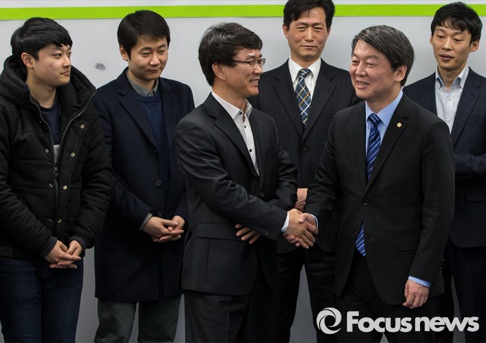 (서울=포커스뉴스) 28일 오후 서울 강남구 창업지원센터에서 열린 '국민의당-핀테크 기업인 간담회'에 참석한 안철수(오른쪽 두번째) 인재영입위원장이 국민의당 정책자문으로 영입된 유철종(가운데) 크라우드연구소 대표와 악수하고 있다.