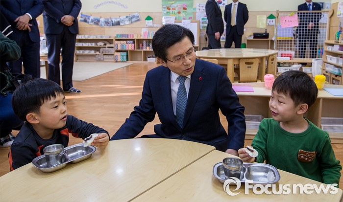 (서울=포커스뉴스) 만3-5세 유아에게 공통적으로 제공하는 교육, 보육 과정인 누리과정 예산 파행으로 보육대란이 이어지고 있는 28일 오후 서울 종로구 한 어린이집을 찾은 황교안 국무총리가 어린이들과 대화를 나누고 있다.