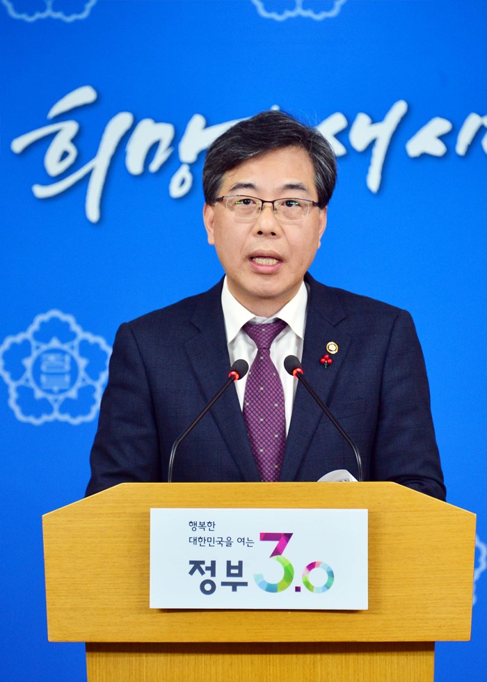(서울=포커스뉴스) 송언석 기획재정부 차관이 28일 서중 종로구 정부서울청사 브리핑룸에서 공공기관 성과연봉제 확대 실시와 관련하여 브리핑을 하고 있다. <사진제공=기획재정부>