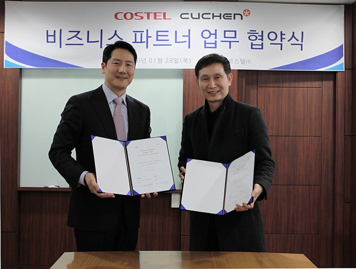 28일 경기도 성남시 코스텔 본사에서 열린 협약식에는 쿠첸 이대희 대표와 이재성 사업부장, 코스텔 유공현 대표, 손성오 경영기획실장, 노재승 영업본부장 등이 참석했다.