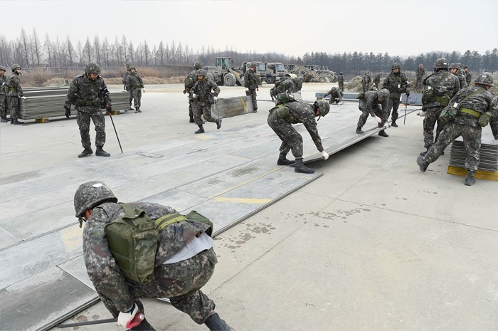 (청주=포커스뉴스) 28일 충북 청주 공군 제17전투비행단에서 시설대대 피해복구반 장병들이 활주로 피해복구훈련을 실시하고 있다. <사진제공=공군 제17전투비행단>