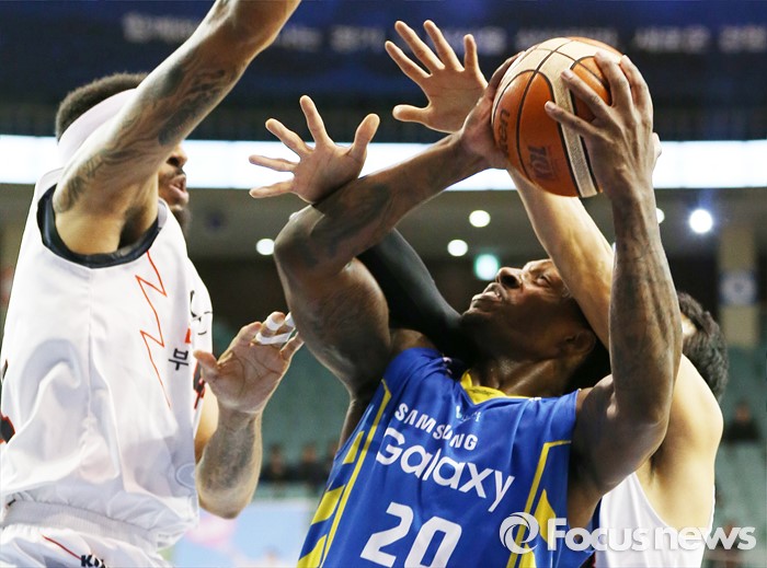 (서울=포커스뉴스) 28일 서울 잠실실내체육관에서 열린 2015-2016 프로농구 삼성-KT 경기에서 삼성 라틀리프가 KT 심스와 김현민의 마크를 받으며 골밑슛을 노리고 있다.