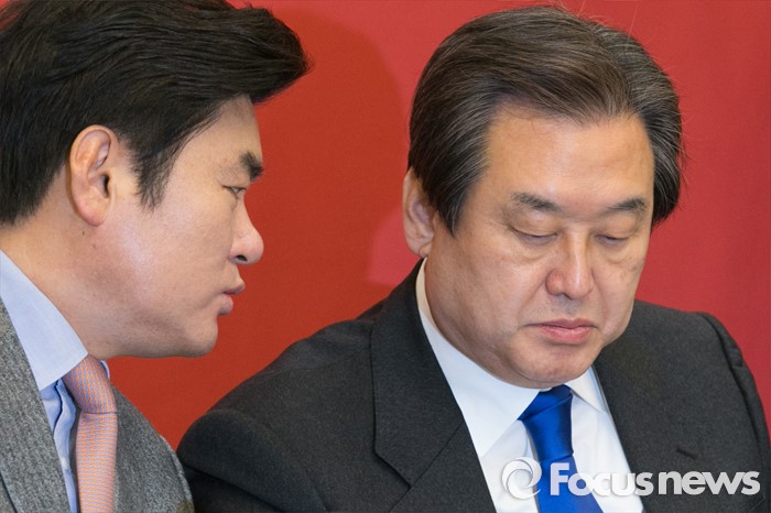 (서울=포커스뉴스) 김무성(오른쪽) 새누리당 대표와 원유철 원내대표가 29일 오전 서울 여의도 국회에서 열린 저출산 대책 당정협의에 참석해 대화하고 있다.