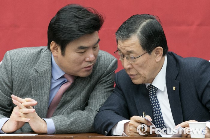 (서울=포커스뉴스) 원유철(왼쪽) 새누리당 원내대표와 황진하 사무총장이 29일 오전 서울 여의도 국회에서 열린 원내대책회의에 참석해 대화하고 있다.