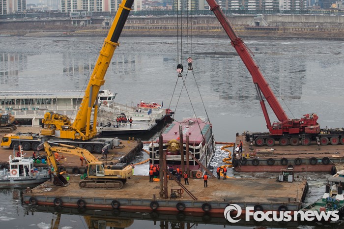 (서울=포커스뉴스) 지난 26일 오후 2시 28분쯤 서울 광진구 영동대로 남단에서 침몰한 이랜드 크루즈 유람선 ‘코코몽호’의 인양과 예인이 29일 오전 1시 25분쯤 완료됐다.