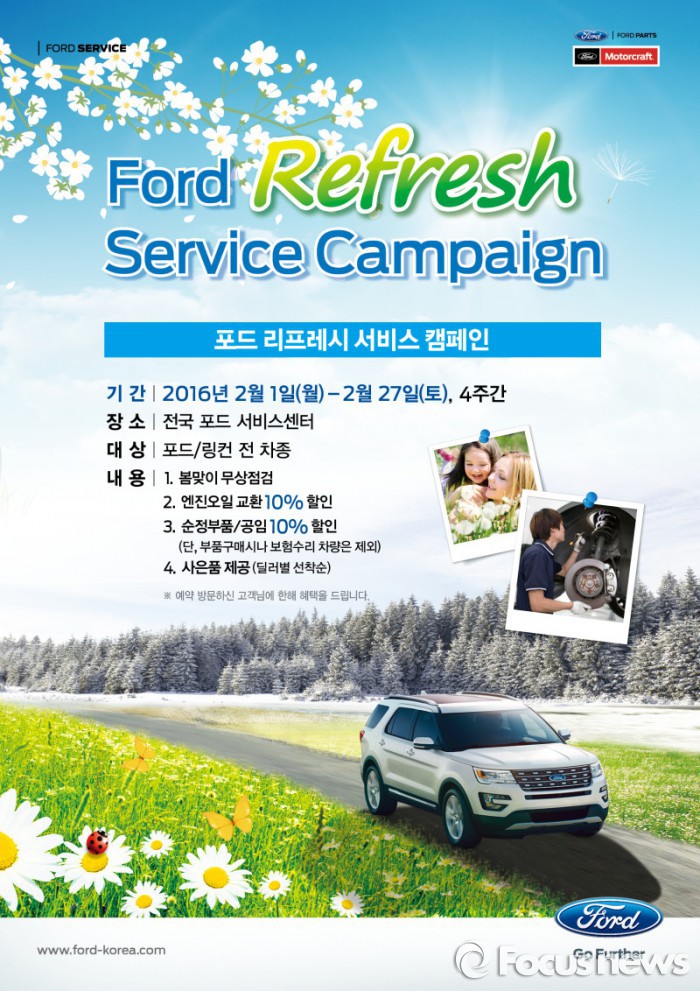 (서울=포커스뉴스) 포드세일즈서비스코리아는 내달 1일부터 27일까지 차량 무상 점검 서비스인 '리프레시 서비스 캠페인'을 진행한다고 29일 밝혔다.