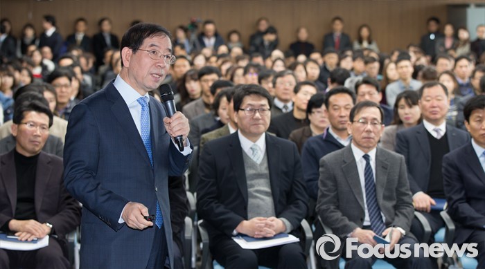 (세종=포커스뉴스) 박원순 서울시장이 29일 오전 세종시청 대강당에서 '협치와 혁신으로 만드는 함께 행복한 삶의 특별시, 세종시와 함께합니다'를 주재로 특강을 하고 있다.