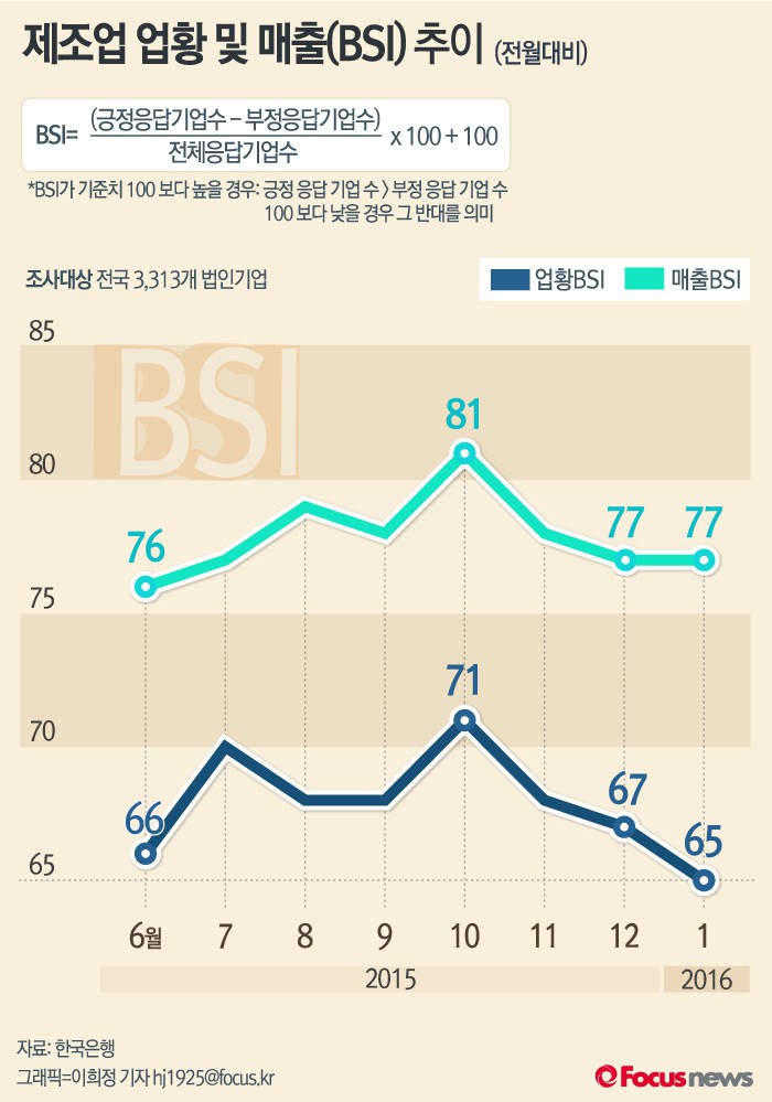 (서울=포커스뉴스) 28일 한국은행에 따르면 1월 제조업 업황BSI(기업경기실사지수)는 65로 전월대비 2포인트 떨어졌다.지난해 10월 업황BSI는 71이었다가 11월 68, 12월 67로 떨어지며 3개월 연속 내림세를 보였다. 매출BSI의 1월 실적은 77로 전월과 같았다.