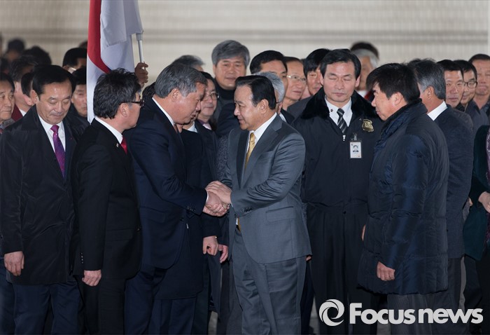 (서울=포커스뉴스) 고 성완종 전 경남기업 회장에게 불법 정치자금 3000만원을 받은 혐의로 기소된 이완구 전 국무총리가 29일 오후 1심 선고공판에 출석하기 위해 서울중앙지방법원으로 들어서며 지지자들과 인사를 나누고 있다.