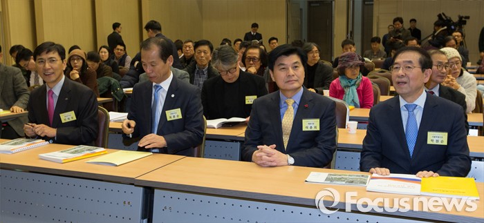 (세종=포커스뉴스) 29일 오후 세종시 정부세종컨벤션센터 국제회의장에서 열린 국가균형발전선언 12주년 기념행사 및 심포지움에 박원순(오른쪽부터) 서울시장, 이춘희 세종시장, 최문순 강원지사, 안희정 충남지자가 참석해 자리에 앉아 있다.